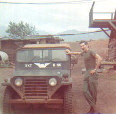Casper TOC SP4 Tony Simmons standing next to Maj Willards jeep "Sky King" LZ English 1969