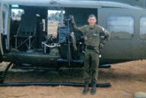 Crew Chief SP5 Wendell Wingert standing next to his ship Casper 293 at LZ English 1970