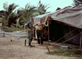Crew Chiefs Ned Costa & Bill Krueger "On Guard" in front of their tent with a view of the Ghost Town flight line in 1968